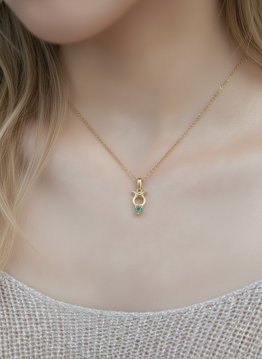 10K Solid Gold Taurus Emerald Pendant Necklace: Au 417 Bull May Zodiac Sign