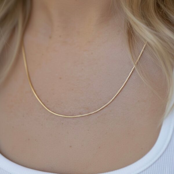 ✅ Free ShippingMinimalist, dainty, and timeless — this 14K solid gold box chain necklace is a jewelry box essential. Crafted in Au 583 real gold, the sleek 0.8mm box link design offers just the right balance of delicacy and durability. Available in both yellow gold and white gold, this fine chain is perfect for wearing solo for a clean look or pairing with your favorite pendant for a touch of elegance.